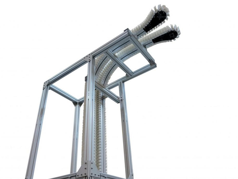 夾持輸送機(jī)由2臺(tái)相互平行的FlexMove輸送機(jī)組成,利用聚氨酯夾緊鏈板楔夾住產(chǎn)品的兩側(cè)實(shí)現(xiàn)垂直升降。